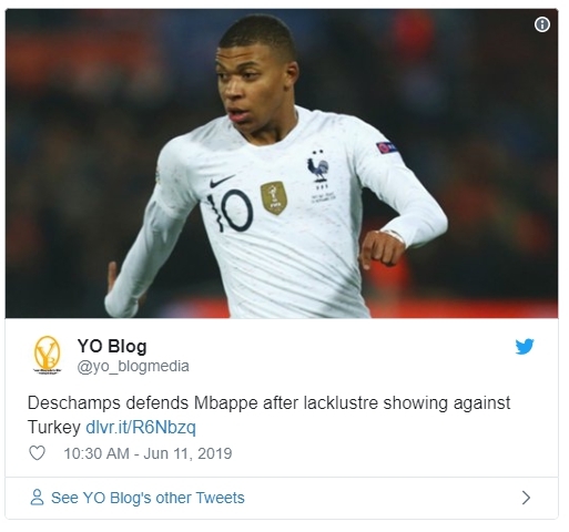 ในเกมพ่ายต่อ ตุรกี 2-0 เมื่อวันก่อน ว่าไม่ควรถูกรุมวิจารณ์แต่เพียงผู้เดียว ในเกมที่เราแพ้ ตุรกี นอกจาก ฮูโก้ ยอริส ผู้รักษาประตูแล้ว ผู้เล่นเอาท์ฟิลด์ทั้ง 10 คนมีฟอร์มที่แย่มาก ต่ำกว่ามาตรฐานซะจนน่าเขกกะโหลกอย่างแท้จริง กุนซือแชมป์โลก กล่าว ผมพูดว่าทุกคนเล่นแย่ แต่สื่อทั้งหลายต่างพุ่งเป้าโจมตีไปที่ฟอร์มของเด็กอายุ 20 ปีอย่าง เอ็มบัปเป คนเดียวเท่านั้น แน่นอน ในมุมมองของผู้จัดการทีมฟุตบอล ผมก็เห็นเหมือนทุกคนนั่นแหละว่าเขาทำผลงานไม่ค่อยดี และมีการเคลื่อนที่ที่ค่อนข้างแย่ เมื่อเทียบกับนัดอื่น ๆ เล่นเสี่ยงมากไปแล้วไม่สำเร็จหลายครั้ง การยืนตำแหน่งก็มักจะเสียเปรียบ แต่ผมไม่คิดว่าเราจะต้องไปคาดคั้นเอาอะไรจากเขาให้มันมากเกินไปนัก นักฟุตบอลทั่วโลกทุกยุคสมัยล้วนมีวันที่ดีและแย่ ซึ่งหลังเกมจบเราคุยกันอยู่แล้วว่าต้องทำยังไงเพื่อปรับปรุง ซึ่งทุกคนในทีมได้รับคำแนะนำหลังเกมจากผมเหมือนกันหมด ไม่ใช่แค่ เอ็มบัปเป คนเดียว